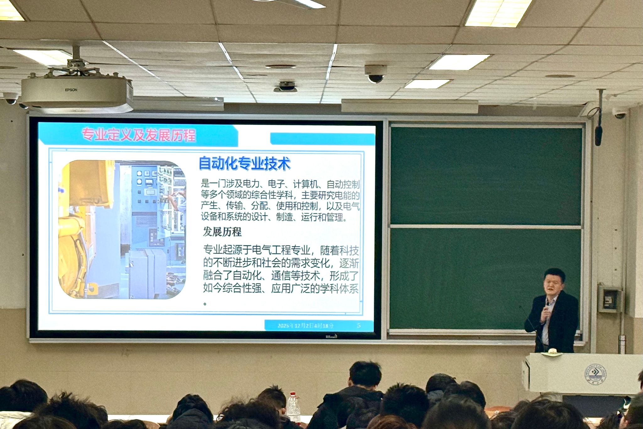 吴新文结合石油化工行业的实际生产场景,从油田化工生产数据分析的核心逻辑切入,详细讲解了专业仪器仪表、流体泄漏故障诊断与定位系统的技术原理和应用流程。同时,他还围绕多相油水分析、无线智能仪表的研发与落地,以及大数据分析算法、智能巡检机器人在石化现场的实操应用展开深入解读,通过具体案例展现了自动化技术如何解决石化行业生产中的效率、安全等关键问题,让同学们直观看到自动化技术与石化产业融合的实际价值。此外,吴新文还结合行业发展趋势,分析了自动化专业在石化领域的就业方向与技术需求,为同学们梳理了专业学习的重点与方向。
